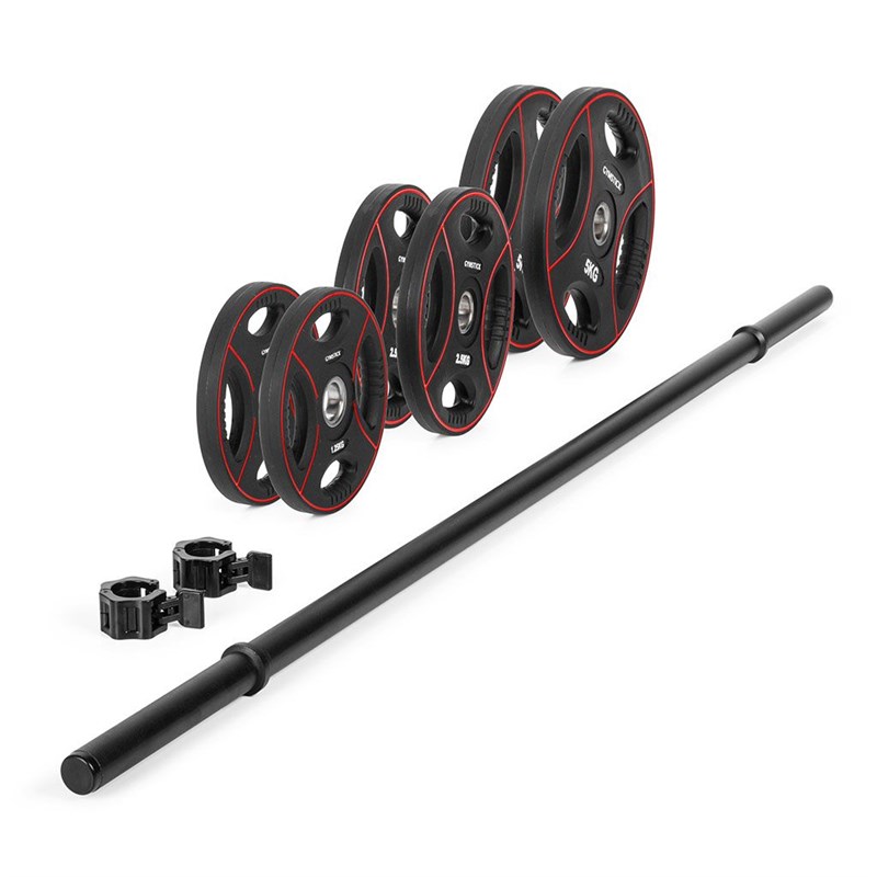 Das Gymstick Pro Pump Set im stylischen schwarzen Look bringt alles mit, was hierzu benötigt wird. Die Stange ist außerdem komplett gepolstert, was insbesondere dem Nacken bei Squats zugute kommt. Die im Set enthaltenen Hantelscheiben sind komplett gummiert und mit Griffmulden zur separaten Nutzung versehen.