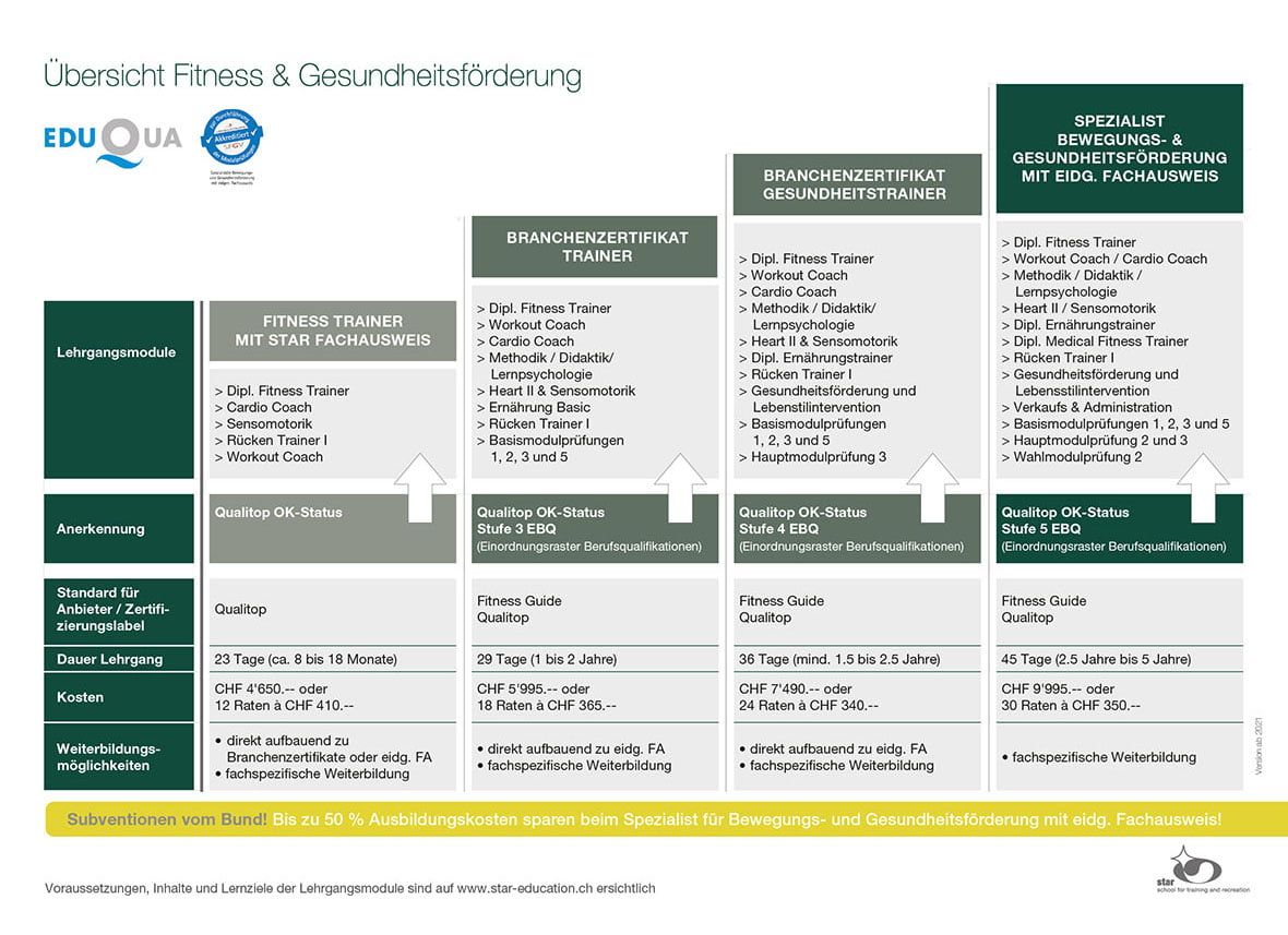 Wir bieten hochwertige, marktorientierte und anerkannte Lehrgänge an. Von der fundierten Basis, Ausbildung Fitness Trainer mit star Fachausweis, über die Branchenzertifikate Trainer / Gesundheitstrainer bis zum Spezialist Bewegungs- und Gesundheitsförderung mit eidg. FA, sowie spezifische Fachmodule.